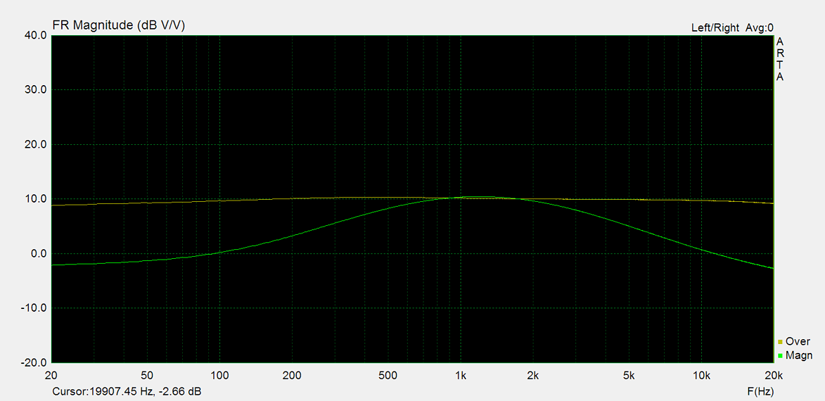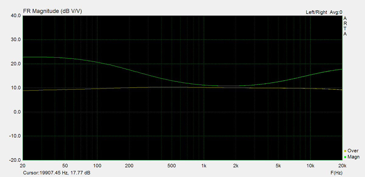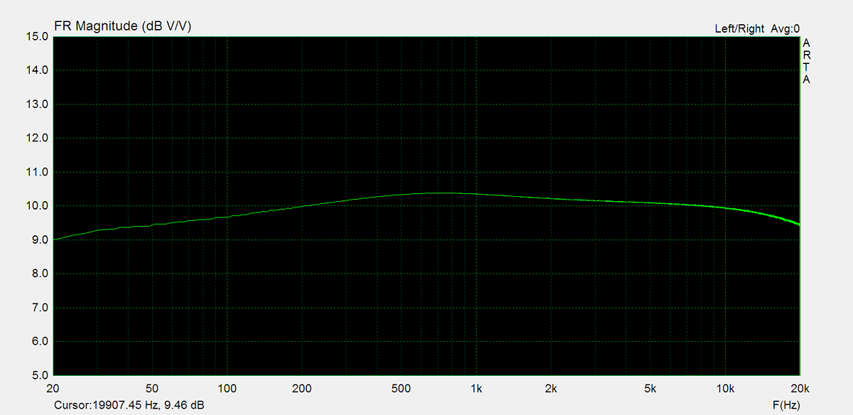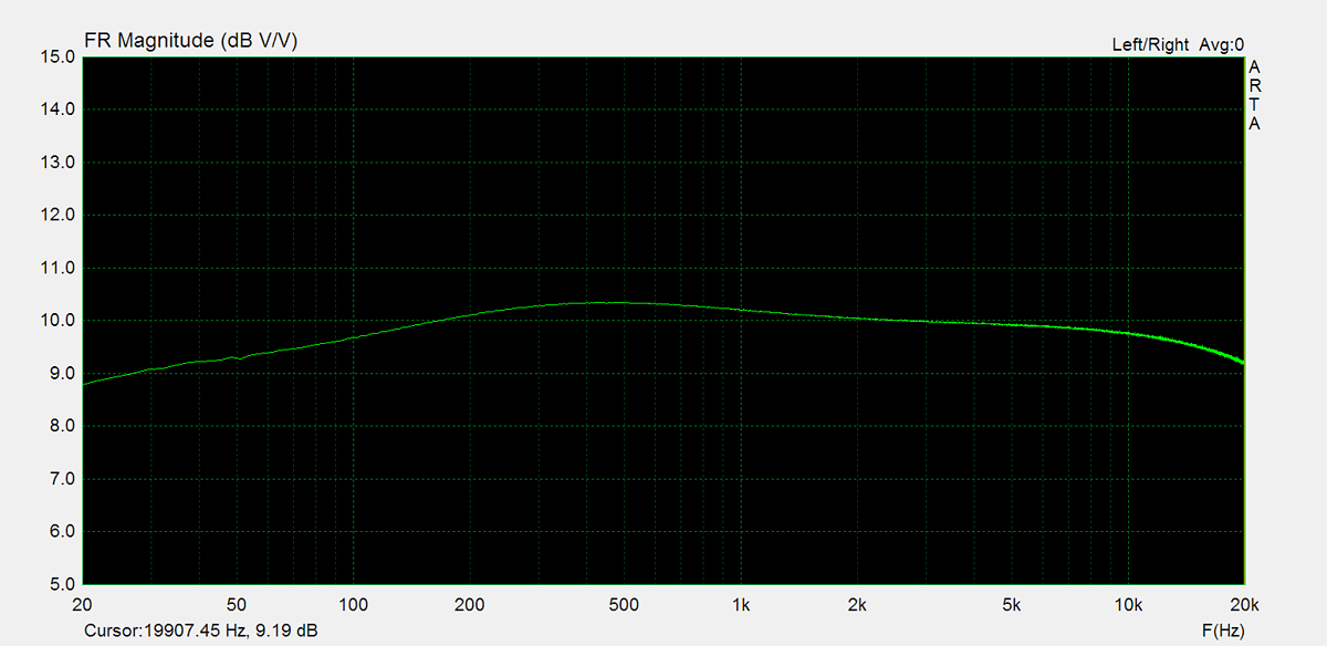 Frequency response is measured using several equilizer settings. 'Flat' indicates the tone controls are either turned off or set to their neutral position. 'Max' and 'Min' refer to the maximum and minimum tone control positions, respectively. In the phono section, the expected response follows the RIAA equalization curve.