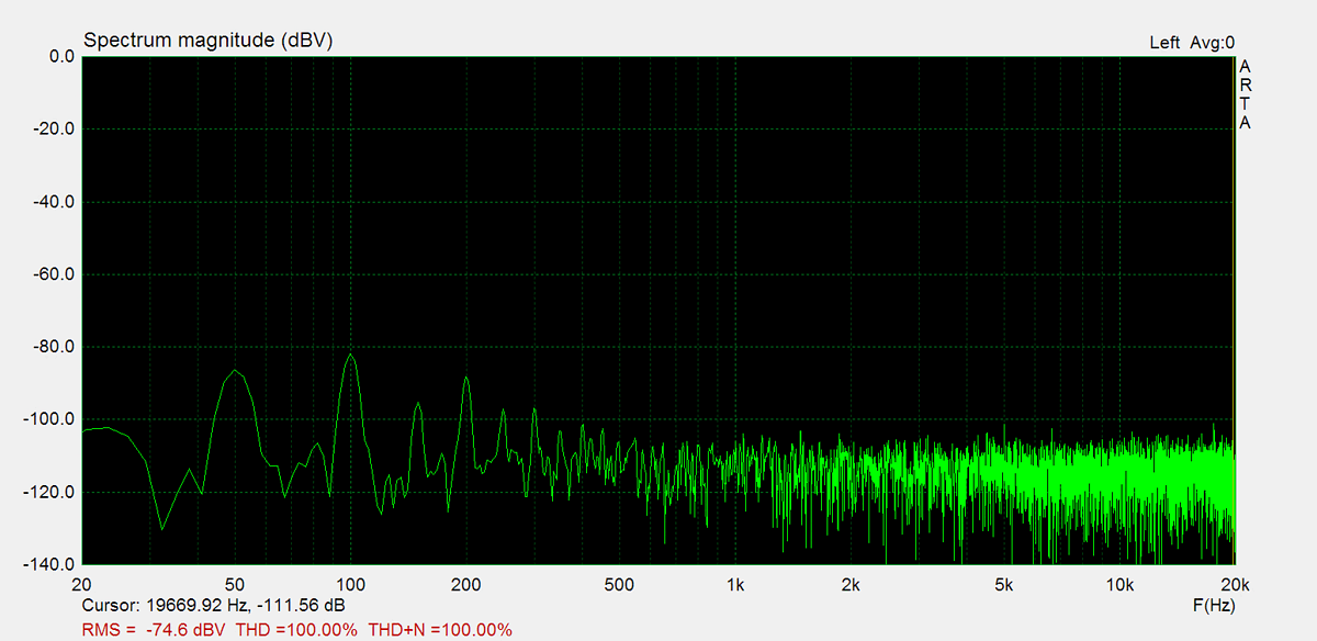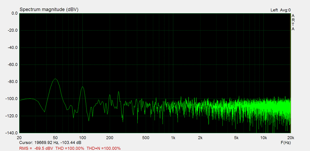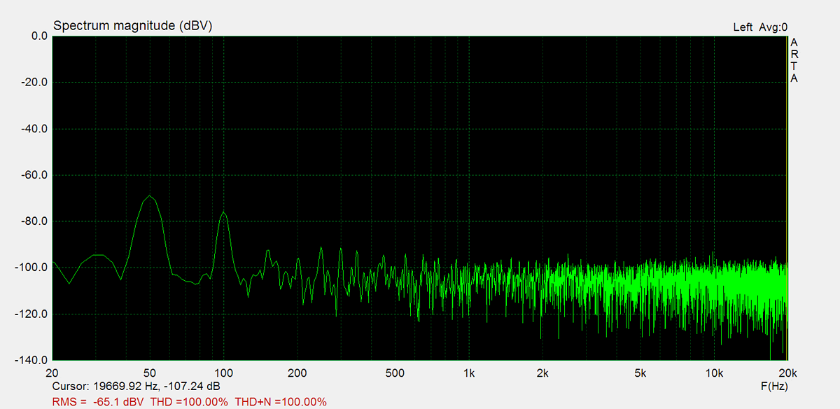 These graphs display the noise levels at various volume positions. To eliminate any interference from the input signal, the input lines are shorted during the measurement. Generally, the noise is highest at the mid-point of the volume range (50%)