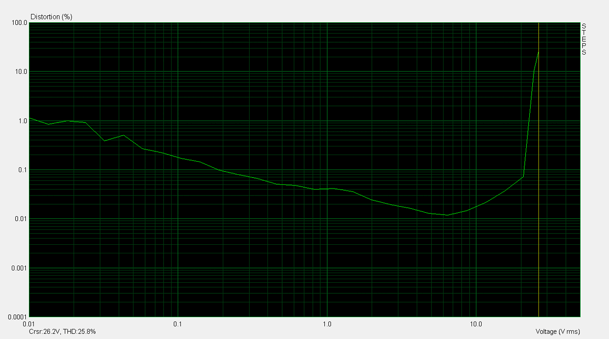 Maximum power is measured using 8Ω resistors on both channels. A 1kHz sine wave input signal is applied and gradually increased until higher harmonics rise significantly. Typically, this is the point at which output clipping occurs.