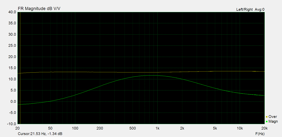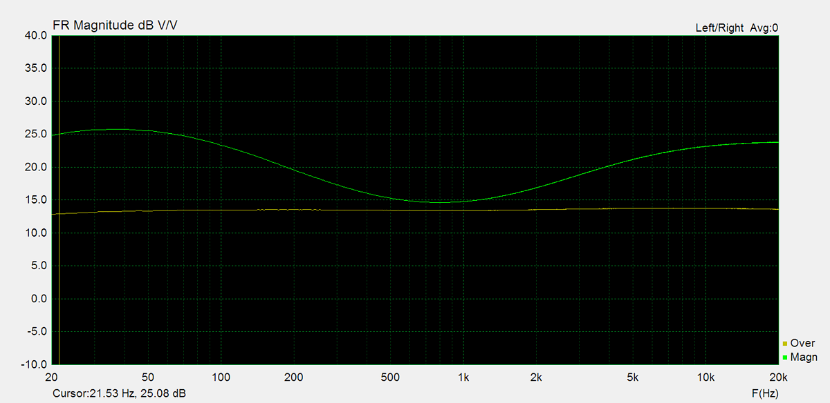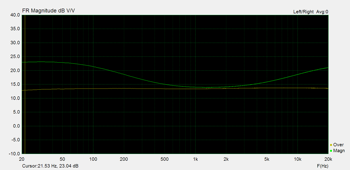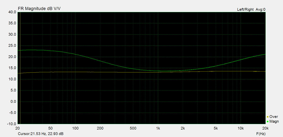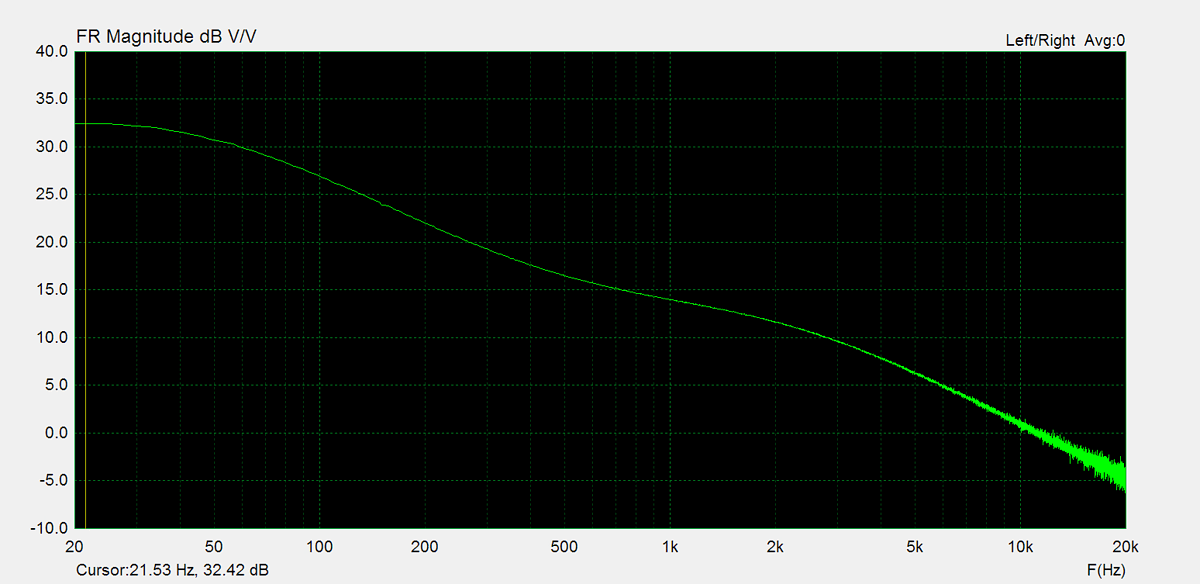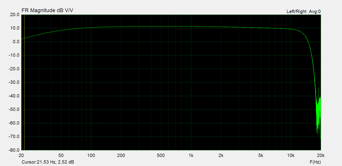 Frequency response is measured using several equilizer settings. 'Flat' indicates the tone controls are either turned off or set to their neutral position. 'Max' and 'Min' refer to the maximum and minimum tone control positions, respectively. In the phono section, the expected response follows the RIAA equalization curve.