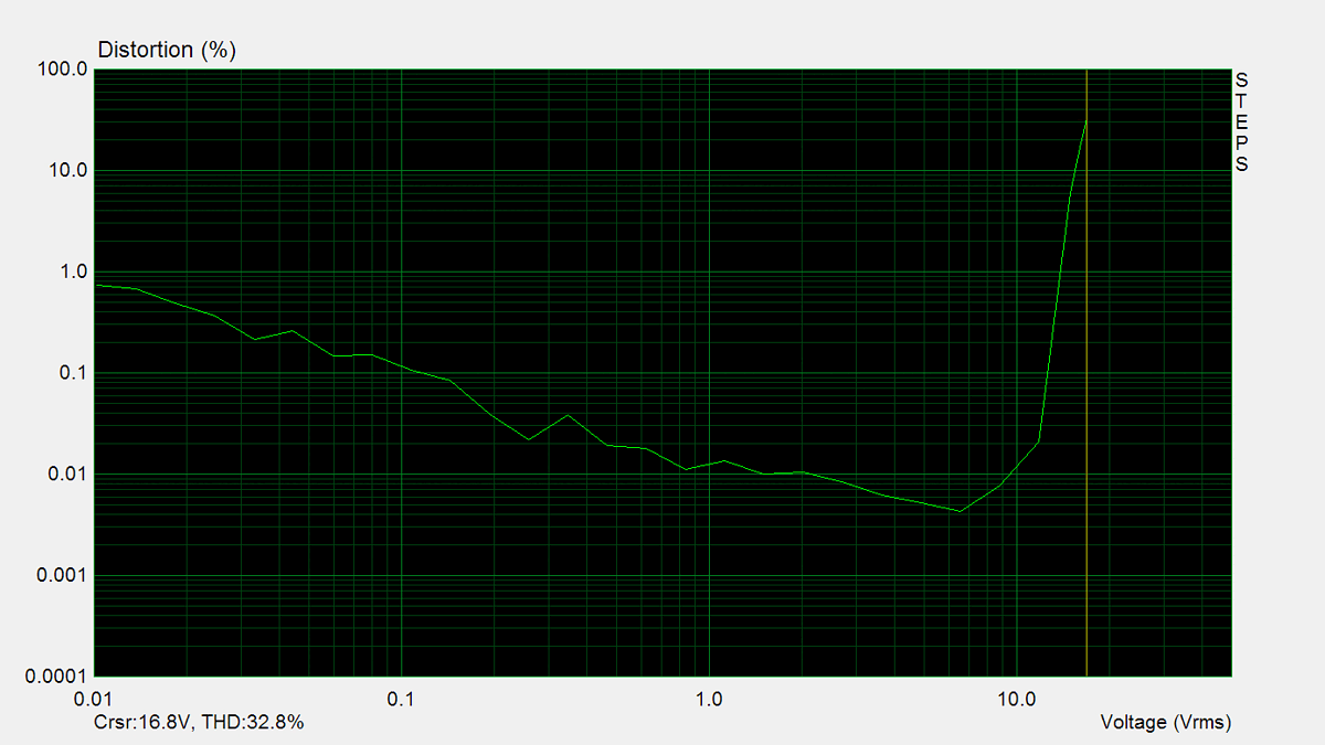Maximum power is measured using 8Ω resistors on both channels. A 1kHz sine wave input signal is applied and gradually increased until higher harmonics rise significantly. Typically, this is the point at which output clipping occurs.