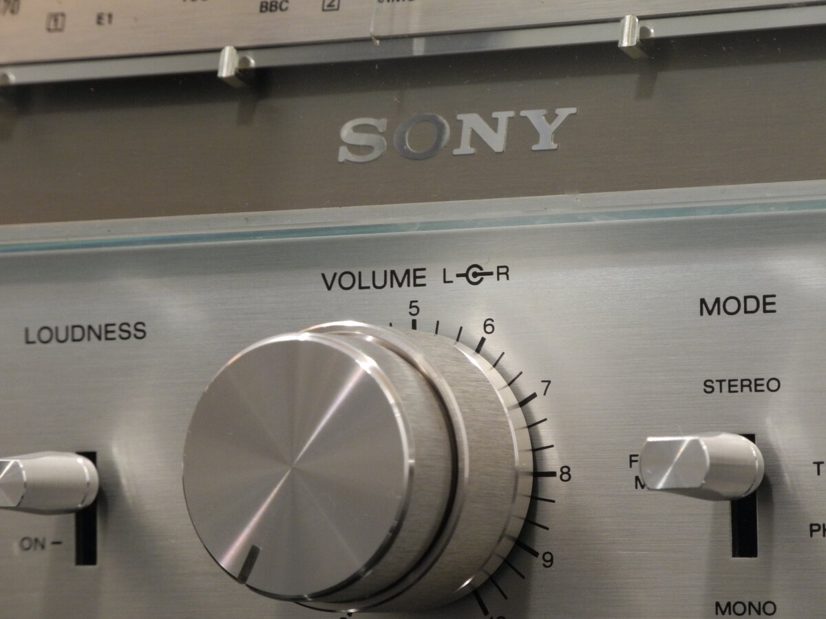 The device's visual appearance is classic Sony design from that era, with a silver faceplate and stylish, jewelry-like knobs. One interesting feature is the set of mechanical markers on the tuning scale, which can be positioned to help memorize favorite radio stations.