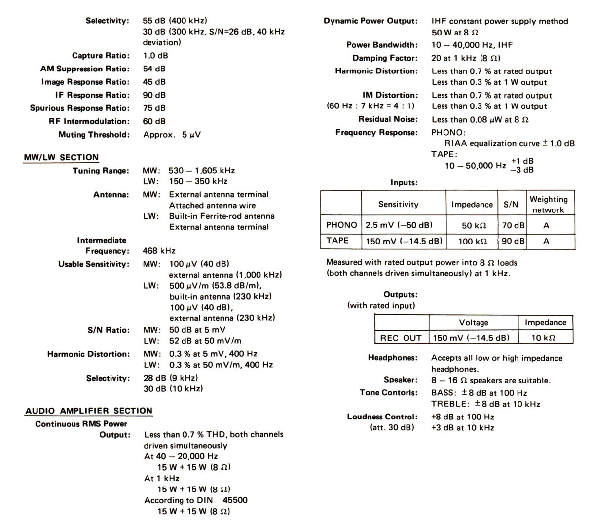 Tuning options: FM, MW, LWMaximum power (8Ω): 15W